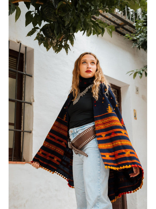 Increíble bufanda realizada en lana y decorada con bordados artesanales de estilo Piyar, con hilos de algodón multicolores, una pieza con historia y trabajo detrás de su belleza. Terminada con borlas alrededor. Múltiples colores a elegir.